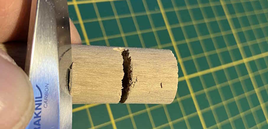 Nun musst du ein kleineres Holzstück anfertigen, welchen ziemlich genau den Durchmesser hat, wie das Loch. Danach muss ca. ein Drittel des Durchmessers abgeschnitten werden, damit das Stück Holz in das Loch passt, aber wie im nächsten Schritt zu sehen ein kleiner Luftspalt bleibt.