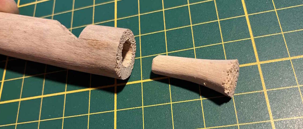 So sieht die Pfeife aus, wenn das Holzstück reingeschoben und abgeschnitten ist aus.